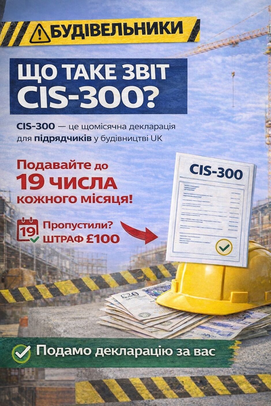 Робота підрядником у будівельній сфері у Великій Британії дає багато переваг — більше свободи у виборі проєктів, клієнтів та графіку роботи. Проте є одна важлива адміністративна вимога, якої не можуть уникнути будівельні підрядники — щомісячна подача декларації CIS (Construction Industry Scheme).